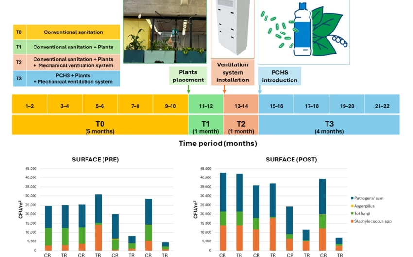 Despite the study limitations (monocentric, limited time period, lack of NGS analysis), the collected results show that a combined strategy aimed at improving the indoor microbiome could be effective in controlling pathogen contamination, AMR diffusion, and environmental parameters (CO2, temperature, humidity) in the school areas. The sustainable interventions adopted in the test classroom included the addition of plants, mechanical