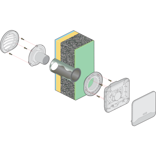 EHT² permette di immettere aria fresca in casa tramite un condotto passante nel muro e una protezione all’esterno, lato facciata. Nel condotto viene inoltre inserita una schiuma per isolamento acustico per consentire l’attenuazione sonore dei rumori provenienti dall’esterno.