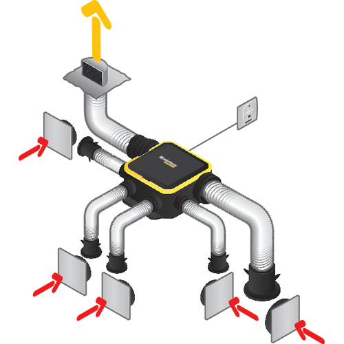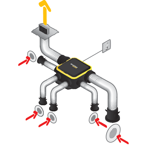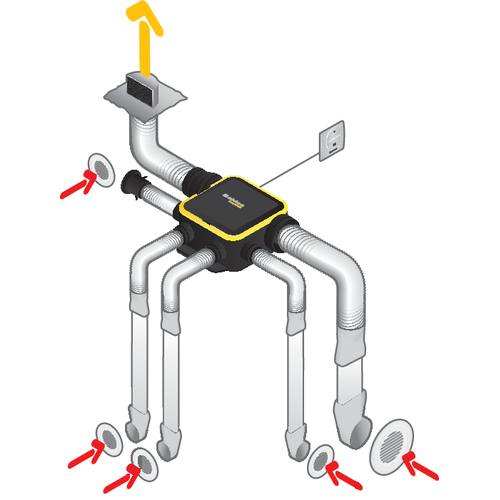 - Portata estratta in continuo 24 ore su 24 regolate automaticamente su ogni attacco grazie ai regolatori cucina, bagno e WC